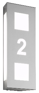 Das Produkt ist in Edelstahl und wahlweise auch in anthrazit pulverbeschichtet lieferbar in Kombination mit weißem Opalglas. Schutzart IP44. Anmerkung: Durch die nach hinten abgeschrägten Seiten entsteht eine indirekte Beleuchtung. Hausnummern negativ gelasert HN/N auf Anfrage sind auch dreistellige Ziffern und Buchstaben möglich.