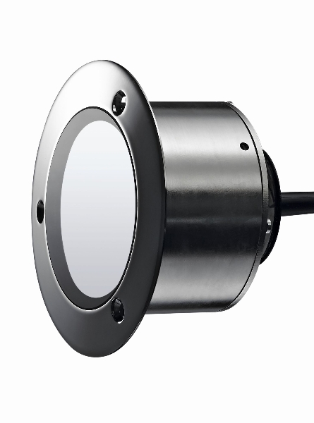 LED Einbaustrahler für Pools und Teiche; kompakte Bauform, nur 10 cm Durchmesser, mit THERMOPROTECT Überhitzungsschutz, dimmbar; Gehäuse V4A Edelstahl, hochglanzpoliert; IP 68; 24 V DC; 20 W; 4000 K; 1940 lm; 120° diffus; CRI >80; 5 m PUR Anschlusskabel, offen; mit Montageschrauben; Abmessungen: H 100 mm x B 100 mm x T 75 mm